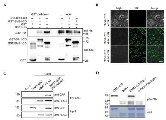 The downstream components of BRI1 have been identified previously. However, the direct downstream substrates of EMS1 are not clear. The similar molecular functions of EMS1 and BRI1 strongly indicate that they should share the common downstream substrates. BSK1 and BSK3 belong to a receptor-like cytoplasmic kinase subfamily RLCK-XII; previously, they were proven to be direct substrates of BRI1 [,]. To test whether BSK1 and BSK3 are the substrates of EMS1, we performed the pull-down assay by obtaining GST-BRI1-CD, GST-EMS1-CD, BSK1-His, and BSK3-His recombinant proteins. The recognized interactions between BRI1, BSK1, and BSK3 were performed as the positive control in this experiment [,]. The result showed that, similarly to BRI1, the BSK1 and BSK3 interacted with EMS1 directly (Figure 5A and Figure S7A). This result was also confirmed by the bimolecular fluorescence complementation (BiFC) and coimmunoprecipitation (Co-IP) analyses (Figure 5B,C and Figure S7B). Epidermal cells of Nicotiana benthamiana leaves co-expressing EMS1 fused to the N-terminal half of YFP (nYFP) and BSK1, or BSK3 fused to the C-terminal half of YFP (cYFP), showed strong fluorescence signals. By contrast, co-expressing EMS1-nYFP with cYFP did not generate the fluorescence signals (Figure 5B). We performed the Co-IP assay by expressing BSK1-FLAG, BSK3-FLAG, and EMS1-GFP as negative controls, and co-expressing BSK1-FLAG or BSK3-FLAG with EMS1-FLAG in Col-0. The EMS1 protein was immunoprecipitated by anti-GFP antibodies only in transgenic plants expressing EMS1-GFP&BSK1-FLAG and EMS1-GFP&BSK3-FLAG (Figure 5C and Figure S7B). These results indicated that BSK1 and BSK3 could interact with EMS1.
