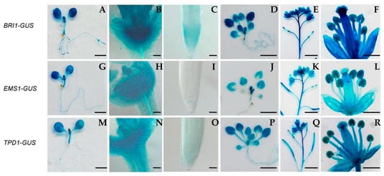 The expression of BRI1, EMS1, and TPD1. (A–F) BRI1::GUS; (G–L) EMS1::GUS; (M–R) TPD1::GUS. From left to right, each small panel represents a seedling 8 days after germination (DAG), a shoot tip from an 8-DAG seedling, a root tip from an 8-DAG seedling, a seedling of 25-DAG, an inflorescence from a 45-DAG plant, and a mature flower from a 45-DAG plant, respectively. Scale bars: (A,G,M) 1 mm; (B,H,N) 50 μm; (C,I,O) 50 μm; (D,J,P) 0.5 cm; (E,K,Q) 0.5 cm; (F,L,R) 1 mm.