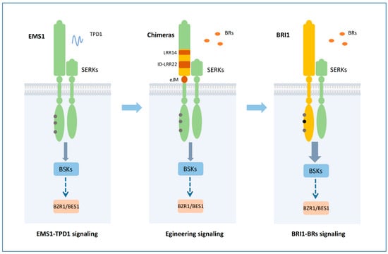 Plants have evolved a large number of cell-surface receptor proteins to sense and respond to developmental and environmental cues. Many of these receptors are leucine-rich repeat receptor-like kinases (LRR-RLKs) with (i) an extracellular LRRs domain perceiving the cognate ligands, (ii) a transmembrane domain, and (iii) a cytoplasmic kinase domain activating downstream signaling [,]. In Arabidopsis thaliana, the BRASSINOSTEROID INSENSITIVE 1 (BRI1) LRR-RLK is found to perceive the plant growth hormones brassinosteroids (BRs); when BRI1 binds with BRs, an intracellular signaling cascade can be initiated, inducing the accumulation of non-phosphorylated forms of two transcription factors, BRI1 EMS SUPPRESSOR 1 (BES1) and BRASSINAZOLE RESISTANT 1 (BZR1), in the nucleus [,,,,,]. Activated BES1 and BZR1 can then mediate the expression of thousands of downstream responsive genes [,,]. The EXCESS MICROSPOROCYTES1 (EMS1) LRR-RLK and its small protein ligand TAPETUM DETERMINANT1 (TPD1) are required for determining the fate of tapetal cells via a signaling transduction pathway shared with BRI1 [,,,,]. To function properly, both BRI1 and EMS1 need the co-receptors from the SOMATIC EMBRYOGENESIS RECEPTOR-LIKE KINASE (SERK) subfamily of LRR-RLKs [,,]. Upon the ligand perception, BRI1 and EMS1 with SERKs lead to the trans-phosphorylation between the cytoplasmic kinase domains of receptors and SERK co-receptors, and to the subsequent activation of the cytoplasmic signaling events [,].