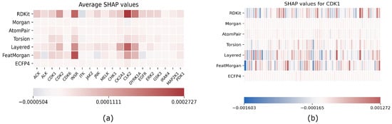 Explainability results using SHAP; (a) average SHAP values for each fingerprint computed on the entire test set separately for each target; (b) example of single target explainability analysis for CDK1: SHAP values are reported for each fingerprint, and each row has been grouped in 64 bins to enhance readability.