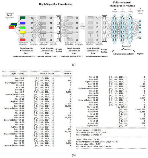 It can be shown that DSC can reduce the number of parameters by a factor of for each layer: Our network was built using only 2,252,959 parameters, which is about a 1:25 ratio with the size of the CDK1-only classifier proposed in our previous work. Figure 2b reports the details of the implemented model.