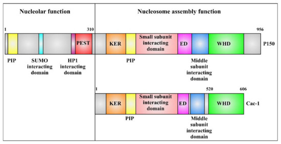 CAF-1 has been found in H. sapiens, D. melanogaster, M. musculus, C. elegans, S. cerevisiae, and A. Thaliana and consists of three subunits in a 1:1:1 ratio in all these species [21,22,23,33,34]. In humans, the subunits forming CAF-1 were named according to the molecular weight based on their gel migration, i.e., P150, P60, and P48 [17], whereas the same counterparts in yeast were referred to as Cac-1, Cac-2, and Cac-3 (Cac, chromatin-assembly complex) [35].