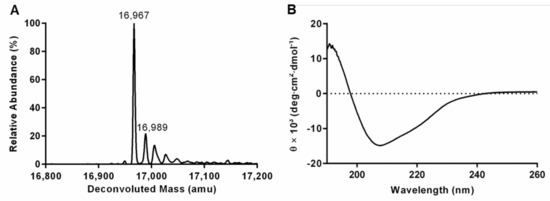 Zhang and coworkers identified the region 727–854 of human P150 as the one corresponding to Cac-1 WHD [42]. Interestingly, Phyre 2 [63], an online software able to predict and analyze protein 3D structures, identified residues 723–824 of P150 as belonging to a stable WHD similar to the one present in the Cockayne syndrome group B protein 1 [64]. Taking together these findings, in order to cover the whole P150 WHD, the protein region encompassing residues 721–860 (hereafter referred as P150721–860) was designed, cloned, expressed, and subsequently purified (Figure S1A). Briefly, P150721–860 gene was cloned into pETM13 vector, allowing the expression of the protein with a His tag at its C-terminal part. Optimized expression in LB was achieved in E. coli BL21(DE3)pLysS strain at 16 °C with 1 mM isopropyl-thio-D-glactosidase (IPTG). Upon three steps of purification, a purity level greater than 95% with a final yield of 2.5 mg/L of growth medium was achieved. Mass spectrometry analyses were carried out to confirm protein identity and purity. Results (Figure 2A) showed one main peak at 16,967 Da corresponding to P150721–860 lacking the starting N-terminal methionine (MWtheoretical = 16,967 Da). This excision, due to the methionylamino peptidase [65], is a widely described phenomenon for recombinant proteins expressed in E. coli [66,67].