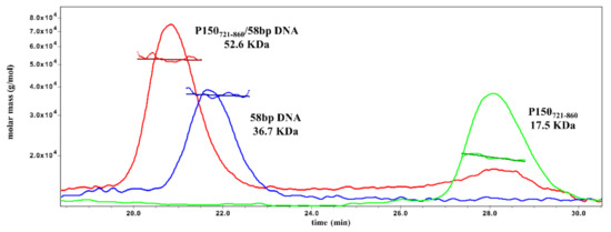 Molar mass of P150721–860, ds58 DNA, and P150721–860 /ds58 DNA complex by SEC-MALS-QELS analysis. Overlay of light scattering chromatograms of recombinant P150721–860 (green line), ds58 DNA (blue line), and P150721–860/ds58 DNA complex (red line) samples. The molar mass of each sample is reported. Runs were performed in 20 mM Tris-HCl, 150 mM NaCl, pH 7.5.