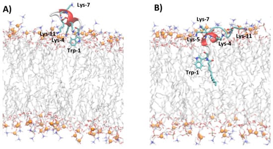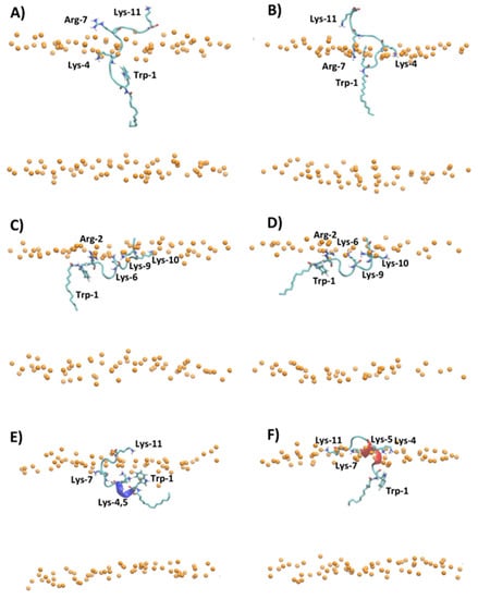 - Reid, K.A.; Davis, C.M.; Dyer, R.B.; Kindt, J.T. Binding, folding and insertion of a beta-hairpin peptide at a lipid bilayer surface: Influence of electrostatics and lipid tail packing. Biochim. Biophys. Acta Biomembr. 2018, 1860, 792–800. [Google Scholar] [CrossRef] [PubMed]