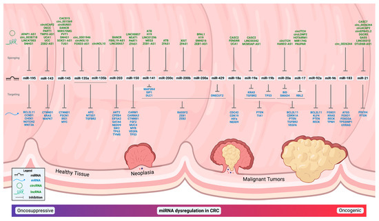 As a generalized class of biomolecules, RNA species occupy a unique niche that can alternate between being transient and/or enduring, while being consequential or seemingly neutral to cellular homeostasis, growth, and survival across a myriad of taxonomic levels of life. While RNA has been known as a unique biomolecule since the 19th century, it came to the forefront of biological study in the mid-20th century upon the discovery that various RNA molecules were, collectively, the transcript, delivery, and production scaffolding for translating the genetic information contained within DNA into functional proteins via ribosomes. However, in the decades since those foundational studies, it has been found that a vast majority of the biological activity of RNA species is not as transcript templates (messenger RNA (mRNA)) for protein synthesis, but rather regulators of gene expression. These non-mRNA RNA transcripts do not primarily function as templates for protein translation and, thus, are called noncoding RNAs (ncRNA). One important class of endogenous regulatory ncRNAs are microRNAs (miRNA), which are 21–25 nucleotides in length when mature following enzymatic processing. Following their initial discoveries as endogenously produced transcripts, it was found that the dysregulation of many specific ncRNAs are tied to malignancies in humans [1,2,3,4]. Subsequent studies into each individual/category of ncRNA built upon these discoveries of dysregulated ncRNA expression to reveal the modes of action on cellular pathways known to be causative in carcinogenesis. Certain miRNAs were found to be key regulators of well-established carcinogenic pathways such as miR-143 and miR-145, acting as tumor suppressors on the p53/c-Myc pathway [5,6], the circular RNA (circRNA) Cdr1as sequestering miR-7, reducing its ability to regulate the proto-oncogenic PI3K/AKT pathway [7,8], and the long noncoding RNA (lncRNA) GAS5-controlling mTOR-mediated proliferation via the competitive binding of glucocorticoid receptors and miR-21 [9,10]. While these miRNAs can affect many distinct cellular pathways, there is oftentimes an overlap and/or interplay between unique ncRNAs classes that results in the pathological alterations of many signaling pathways at the cellular level. This can manifest, for example, when lncRNAs or circRNAs competitively sequester miRNAs from their targeted mRNAs (collectively known as competitive endogenous RNAs, ceRNA) through complementary base pairing, known as “sponging”, as seen between the long noncoding RNA (lncRNA) HOTAIRM1 or the circular RNA (circRNA) circITCH and miR-17 [11,12]. Colorectal cancer (CRC) most commonly manifests as neoplasias consisting mainly of mutated intestinal epithelial cells that are unable to maintain a proper differentiation status and/or connections to neighboring cells, leading to unchecked cellular division and the dysregulation of oncogenic and/or tumor-suppressive genes [13,14]. Most CRC cases do not yet have a prescribed causative provenance and are, thus, considered sporadic (70%) [15]. For decades, invasive colonoscopies have been the most common form of early detection for CRC and they luckily reduce the death rate by about 50% [16,17]. Unfortunately, this reduction in mortality appears to be largely associated with carcinomas found on the left side of the colon as they are easier to observe and remove [18], leaving around 10% of all CRCs undetectable via colonoscopy [19]. This inability to robustly detect CRC regardless of the location provides the impetus to find biomarkers, such as miRNAs, in excreted bodily fluids (stool/serum/plasma) that could potentially diagnose CRC in various colonic regions. These strategies of measuring levels of known oncogenes in bodily fluids (mainly serum, plasma, or stool) have already begun to be investigated and employed for miRNA [20,21,22], lncRNA [23,24], and circRNA [25,26]. Unfortunately, due to miRNAs primarily exerting direct influence on other RNA molecules or proteins, which may or may not coexist together with the miRNA of interest, the basic presence or absence of any given miRNA is not necessarily enough to diagnose CRC. This conundrum adds a layer of difficulty in attempting to understand the relationship of these miRNAs to GI pathologies resulting in many unclear, or even contradictory, connections between the disease state and miRNA across samples and studies. Thus, to avoid a cavalcade listing of any miRNAs statistically associated with CRC, this review focuses on known miRNA signatures found within the biofluids of CRC patients, that also have accompanying evidence-based mechanistic hypotheses which represent ideal candidates for the use of biomarkers as diagnostics and/or therapeutics.