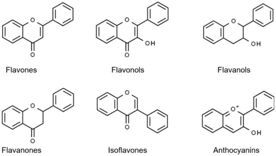 Flavonoids are a diverse family of natural phenolic compounds commonly found in fruits, vegetables, tea, wine, and Chinese herbal medicine []. Flavonoids have a basic C6–C3–C6 15 carbon skeleton composed of two aromatic rings and one pyran ring. Flavonoid compounds are divided into six subclasses based on their carbon structure and level of oxidation, which are flavones, flavonols, flavanones, isoflavones, flavanol, and anthocyanins (Figure 1) []. In addition to the well-known antioxidant activity, flavonoids also possess anti-inflammatory, vasodilator, anticoagulant, cardioprotective, antidiabetic, chemical protection, neuroprotective, and anti-obesity activities []. Recent studies have shown that flavonoids also have suitable anti-aging activities. The combination of quercetin and dasatinib has been observed to eliminate senescent cells in vitro, improve physical function, and increase the lifespan of mice in vivo []. More interestingly, in phase I clinical trials in patients with diabetic kidney disease [] and idiopathic lung disease [], dasatinib administration with quercetin has been shown to effectively reduce the expression of the aging markers p16 and SA-β-gal. More flavonoids, such as fisetin and luteolin, have also been found to eliminate senescent cells and have anti-aging effects [,]. However, the anti-aging mechanism of flavonoids is not yet fully understood, and more research is needed to provide a basis for their clinical applications in humans.