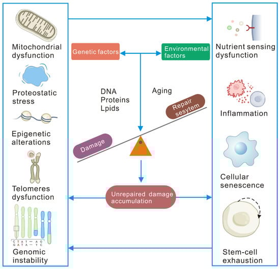 Although the current understanding of aging is still in the early stages of genetic discovery, existing evidence shows that human aging is driven by the balance of damage and repair processes and is affected by environmental exposure and genetics (Figure 2). One of the characteristics of aging is its association with macromolecular damage. When the organism cannot replace cells at will or dilute the damage, intracellular damage accumulates, hurting the host cell and other cells, impairing its function and ultimately leading to age-related diseases and aging itself. The nine hallmarks of aging have been summarized [] and are widely recognized by aging research scientists. Genomic instability, telomere attrition, epigenetic alterations, and loss of proteostasis are the primary causes of damage. The most common types of macromolecular damage are DNA protein and lipid damage.
