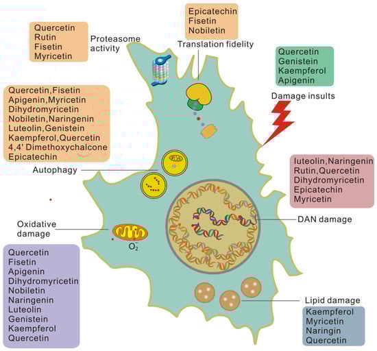 Collectively, flavonoids effectively reduce the damage of DNA, protein, and lipid macromolecules by reducing the insults of damage. At the same time, they can improve the ability of damage repair or clearance, thereby significantly reducing the rate of unrepaired damage accumulating in cells. Due to the important role of unrepaired damage in inducing cell senescence, cells or tissues can benefit from the anti-damage effects of flavonoids.
