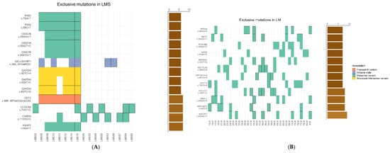 Although comparative analyses of SNVs showed a similar distribution, LMS had a higher mean number of alterations per sample compared to LM (p < 0.05). Then, we focused on group-exclusive variants present in at least six samples of each group to find exclusive variants involved in the pathogenic process of each group. As a result, we found a total of thirteen variants affecting eight different genes exclusive to LMS (Figure 1A), while we found a total of twelve mutations affecting twelve genes exclusive to LM (Figure 1B). In both groups, these mutations were mostly missense mutations, although, in the LMS group, there were other types of variants, i.e., in frame indels affecting the IQCJ-SCHIP1 gene, structural interaction variants affecting the GAPDH gene, and frameshift variants affecting the EEF2 gene. Interestingly, most of the variants detected have been previously reported in other cancer types in the COSMIC database (Supplementary Table S1).