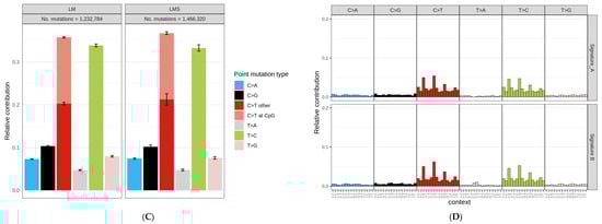 Using this SNV information, we compared the mutational spectrum for the LM and LMS tumors through the relative contribution of six base substitution types (Figure 1C), which were then decomposed into two distinct mutational signatures (Figure 1D).