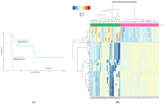 Additionally, we found differences in the number and type of somatic CNVs, suggesting that they could be used for the differential diagnosis of myometrial tumors. Furthermore, we provided novel insights into the potential usefulness of CNVs as a prognostic biomarker for patients with LMS. However, the low number of samples available for the survival analysis (mainly due to a lack of data resulting from the use of commercial samples or censoring) is a strong limitation, and, thus, the tendency we observed should be carefully interpreted and further explored and validated.