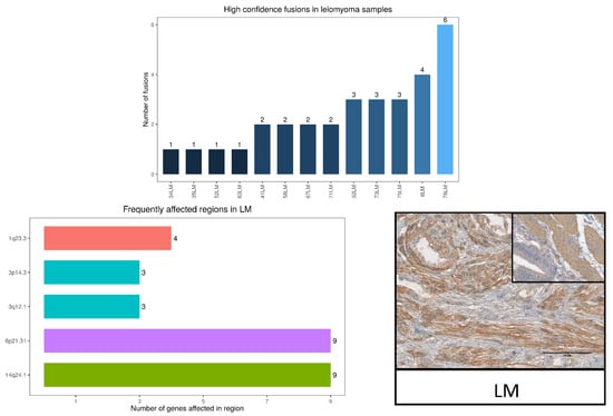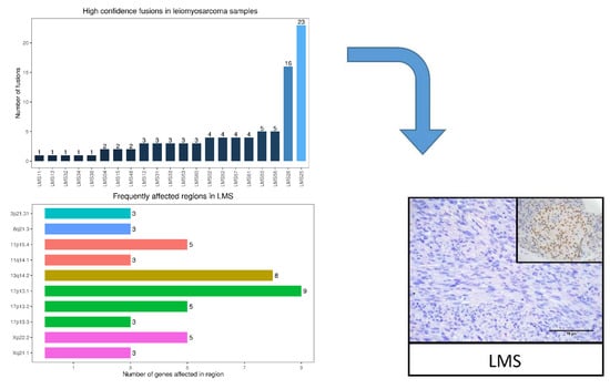First, arriba (https://github.com/suhrig/arriba/, accessed on 31 December 2021) was used for detection of fusions on RNAseq data, which were then validated by immunohistochemistry. Subsequently, differential expression analysis between LMS and LM was performed using edgeR [] and subjected to functional analysis. Some of the most significant DEGs were finally validated using RT-qPCR (Supplementary Table S6).
