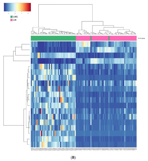 RNA libraries from 44 LM and 34 LMS were constructed using Truseq RNA exome (Illumina, San Diego, CA, USA) and aligned to the human hg19 genome using STAR (https://github.com/alexdobin/STAR, accessed on 31 December 2021) (Supplementary Table S5) to estimate gene transcript abundance with HTseq (https://github.com/simon-anders/htseq, accessed on 31 December 2021).