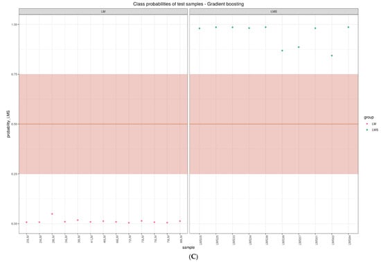 Further, the model was used to classify the samples and to calculate class probabilities, allowing a more fine-tuned classification of the samples, where we defined a “warning range” for those tumors where the model was not confident enough, defined as probabilities of <75% for each group (Figure 4C). Interestingly, this model could correctly classify all the samples with high class probabilities, even for sample LMS39 with the lowest LMS probability.