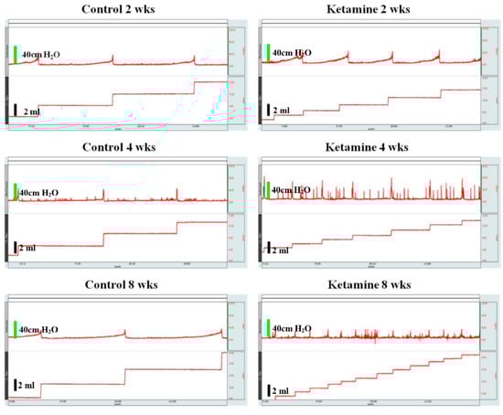 The cystometric measurements of ketamine-injected rats demonstrated bladder dysfunction with impaired bladder contractions at all time course levels in the present study. For instance, all the ketamine-injected rats from three groups (weeks 2, 4, and 8) exhibited bladder dysfunction such as increased frequency of micturition and significantly reduced ICI and voided volumes. This scenario precisely portrayed the typical KC condition, and the complexity of the bladder dysfunction followed an increasing trend according to the dosage duration of the drug from 2 weeks to 8 weeks. This scenario indicated that the severity of voiding function was dependent on the usage of the drug on its time course level, which also proved the association between frequency of drug exposure and progress of bladder dysfunction. Besides this, the increased urinary frequency and reduced ICI and residual volume were mainly due to the small capacity and low bladder compliance, resulting from a contracted bladder condition due to the severity of inflammation [