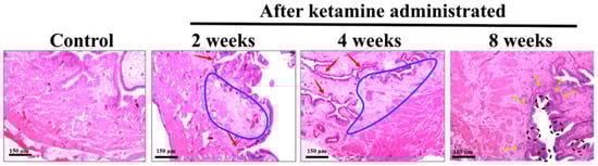 11]. The bladder wall inflammations might initially lead to an ulcerative condition and, later on, to chronic KC. Here, the histological assessment of the bladder tissue with the aid of HE staining revealed an increased level of inflammation. Abnormal tissue morphology and submucosal edema were identified in ketamine-administered rats of 2 and 4 weeks. The rats of 8 weeks exhibited proliferation of urothelial cells with a progressive increase in fibrosis and significant bladder detrusor hypertrophy. These findings indicated that the time and exposure of the drug increased the severity of the disease and its symptoms. Research evidence also substantiated that prolonged ketamine usage caused bladder tumors and premalignant conditions such as squamous metaplasia and nephrogenic metaplasia. Moreover, ketamine-induced urothelial alterations that simulate carcinoma in situ have also been documented [