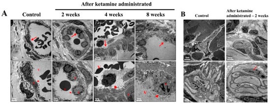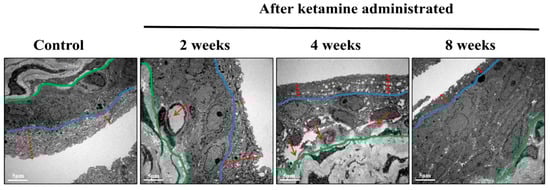 The ultrastructural changes in the nerve and blood vessels have been considered a substantial symptom of KC, and the TEM results of the current study reported significant vessel damages in the endothelium of the bladder in the 4- and 8-week ketamine-treated rats. Recent research has also supported the outcomes of the present study by conforming that ketamine can cause microvascular alterations in the bladder by inducing endothelial cell injury of microvessels and consequent compromised intrinsic microcirculation [