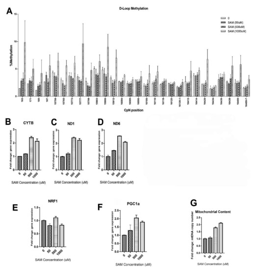 MtDNA pyrosequencing analysis and gene expression in HSkMCs treated with increasing concentrations of SAM (0–1000 µmol/L). (A) D-loop pyrosequencing (163–187, 16084–16457). Mitochondrial and nuclear gene expression: (B) CYTB; (C) ND1; (D) ND6; (E) NRF1; (F) PPARGC1A encoding PGC-1α; (G) mitochondrial copy number.