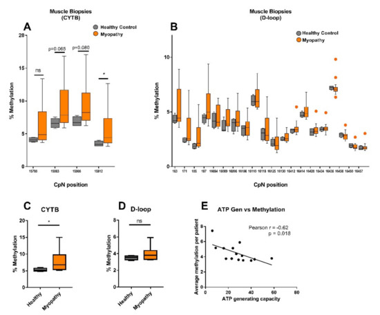 Increased mtDNA methylation in muscle biopsies from myopathy patients compared to healthy samples. MtDNA pyrosequencing analysis of muscle tissue from four healthy controls and 14 myopathy patients. Methylation was quantified by pyrosequencing in the (A) CYTB gene (15798–15812) and (B) D-loop region (163–187, 16084–16457). (C) The average methylation of all 4 CpNs in the CYTB region; (D) the average methylation of all 20 CpNs in the D-loop region; (E) correlation between mtDNA methylation versus ATP-generating capacity (ATP Gen) in muscle biopsies of myopathy patients (each dot represents one patient sample). Pearson’s correlation was used to calculate the correlation between average methylation per patient for all tested cytosines and ATP-generating capacity. Significance was demonstrated as * p ≤ 0.05, compared to the healthy controls, ns: no significant difference.