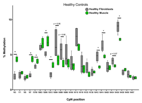 Tissue-specific mtDNA methylation patterns in muscle biopsies vs. healthy skin fibroblast cell lines from healthy individuals. Muscle tissue and skin fibroblasts were obtained from healthy (nonmyopathy) individuals (n = 4 and n = 5, respectively). D-loop (163–187 and 16084–16457) and CYTB (15798–15812) regions were pyrosequenced to quantify mtDNA methylation. Significance was demonstrated as * p ≤ 0.05 compared to the healthy fibroblasts.