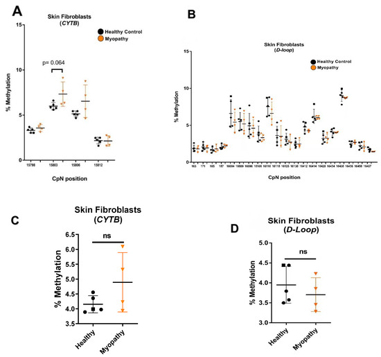 Next, we analyzed four myopathy skin fibroblast samples. Again, CYTB mtDNA methylation values were generally higher than those determined for the five control skin fibroblast samples (Figure 4A). Though the differences were not significant in the small sample size of four myopathy-tissue- and five healthy-tissue-derived skin fibroblasts, the CpT at position 15803 in the CYTB gene showed a borderline significant increase in methylation in myopathy-tissue-derived skin fibroblasts (p = 0.064; Figure 4A). To analyze the CYTB region in more detail, we designed additional primer pairs (14698–14760, 15375–15438, and 15699–15761), and again screened primary skin fibroblasts from three healthy donors and five myopathy patients for mtDNA methylation levels. Using the same patient material, highly reproducible cytosine methylation levels were observed, but no differences were detected between healthy- and myopathy-derived skin fibroblasts at any of the 21 additional analyzed positions in the CYTB gene (Figure S1). In addition, no differences in mtDNA methylation were detected in the 20 positions in the D-loop (Figure 4B). As a result of these observations, differences in mtDNA methylation also were not found between healthy-donor- and myopathy-patient-derived skin fibroblasts when averaging the levels of four analyzed cytosine positions in the CYTB gene (Figure 4C) or all the analyzed cytosines in the D-loop (Figure 4D).