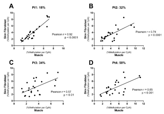 An exploratory correlation analysis was performed between mtDNA methylation levels in muscle tissue and the corresponding skin fibroblasts from four myopathy patients (Pt1, Pt2, Pt3, and Pt4, with ATP-generating capacities of 18%, 32%, 34%, and 58%, respectively) for the analyzed CpN positions within the D-loop and CYTB (15798–15812) (Figure 5). Interestingly, a correlation between CpN location-specific mtDNA methylation in muscle tissue and the corresponding skin fibroblasts was observed for all four patients. Notably, patient Pt1, with the lowest ATP-generating capacity (18%), showed the strongest and most significant correlation between muscle tissue and cultured skin fibroblasts (r = 0.92; p < 0.0001; Figure 5A). These results suggested that cultured skin fibroblasts show promise as a proxy for muscle tissue in myopathy diagnosis.