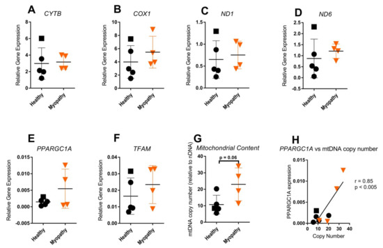 Mitochondrial and nuclear gene expression associated with mitochondrial biogenesis and mtDNA copy number in skin fibroblasts from myopathy patients compared to healthy controls: (A) CYTB; (B) COX1; (C) ND1; (D) ND6; (E) PPARGC1A; (F) TFAM. (G) Mitochondrial content (mtDNA copy number) and (H) correlation analysis for PPARGC1A expression vs. copy number (note that two samples are overlapping). Healthy controls (n = 4, represented as dots, and HDFa16 represented as square) and myopathy patients (n = 4, represented as triangles). None of the comparisons (A–F) reached statistical significance.
