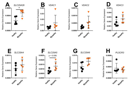 In addition, mRNA expression was determined for various mitochondrial solute and ion transporters. Intriguingly, levels of SLC25A26, a nuclear gene encoding the S-adenosylmethionine carrier (SAMC) localized in the mitochondrial inner membrane, were increased 2.7 ± 0.5-fold (p < 0.05) in myopathy patient fibroblasts compared to healthy control fibroblasts (Figure 7A). Gene expression levels of mitochondrial ion transporters, including VDAC1,2,3, SLC25A4, and SLC25A6, were not significantly changed, though all appeared elevated in the myopathy-derived skin fibroblasts (Figure 7B–G and Figure S2). Levels of SLC25A5, encoding the mitochondrial ADP/ATP translocase 2 (ANT2), were close to significantly increased in myopathy compared to healthy controls (p = 0.056; Figure 7F). Moreover, expression of PLSCR3, encoding phospholipid scramblase 3, which is associated with mitochondria-mediated apoptosis, was not significantly changed in myopathy skin fibroblasts compared to control skin fibroblasts (Figure 7H).