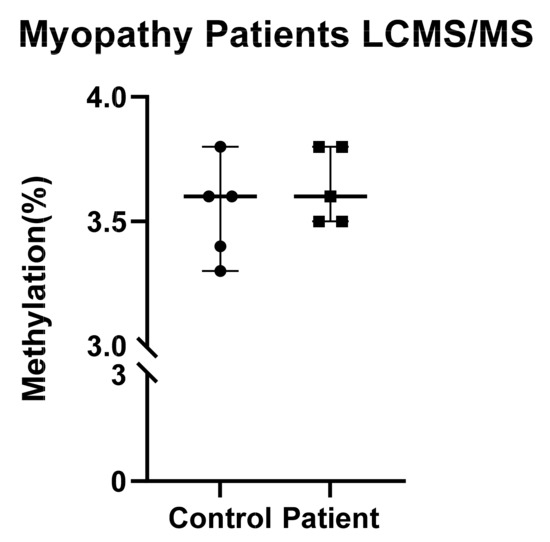 2.2. CYTB mtDNA Methylation Was Higher in Muscle Biopsies from Myopathy Patients Compared to Healthy Controls