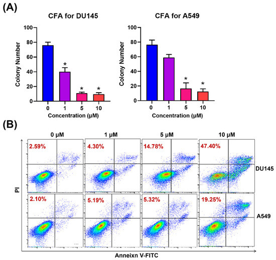 (A) Effect of compound 6e on colony formation in DU145 and A549 cells. (B) Compound 6e induced A549 and DU145 cancer cells apoptosis in vitro. A549 and DU145 cells were incubated with 6e at different concentrations (0–10 μM) for 24 h. Annexin V/PI staining was carried out, and the percentage of apoptotic cells was further determined using flow cytometry. * Statistically significant (n = 2, p < 0.05).