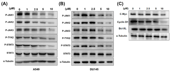 The ability of compound 6e to inhibit the phosphorylation of JAK/STAT3 was determined in A549 and DU145 cells. As shown in Figure 3A,B, after 24 h of treatment with 5-μM 6e, the decreased levels of JAK1, JAK2 and STAT3 were observed in both A549 and DU145 cells, but no significant change was seen with the total STAT3 protein expression. Moreover, compound 6e significantly inhibited the expression of JAK/STAT3 downstream genes c-Myc, Cyclin D1 and Bcl-XL at 10 μM after 24 h of treatment (Figure 3C). Therefore, pretreatment with compound 6e suppressed the JAK/STAT3 signaling pathway and its downstream gene expressions, which were consistent with the above results obtained in vitro.