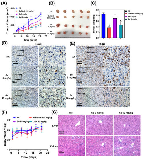To further investigate the antitumor potential in vivo, we evaluated the effects of compound 6e in a nude mice tumor model (Figure 4). After the solid tumor was established, twenty-four nude mice were randomly divided into four groups, which were the vehicle control group, 6e groups (5 mg/kg and 10 mg/kg) and Gefitinib-positive control group. All the compounds were taken by intragastric gavage. Compound 6e at the dose of 10 mg/kg could significantly inhibit tumor growth, and the tumor inhibition rate of 6e was over 40%, which was comparable to that of the positive control (Figure 4A–C). Subsequently, Ki67 and Tunel staining were performed on tumor sections, which showed that tumor proliferation marker Ki67 was significantly inhibited, and the proportion of apoptotic cells that were marked by Tunel-positive staining also significantly increased with 6e treatment at a dose of 10 mg/kg (Figure 4D,E). Moreover, during the administration period, the weight of the nude mice did not increase or decrease significantly, indicating that there was no obvious biological toxicity of 6e (Figure 4F). H&E staining was performed on the liver and kidneys of each group of mice to observe the hepatic and renal toxicity of 6e. The results showed that no significant liver and kidney damage was observed in all the groups of mice, suggesting that 6e was less toxic at therapeutic doses (Figure 4G).
