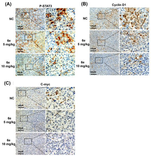 To further test the inhibitory effects of 6e on JAK/STAT3 signaling, the IHC analysis of nude mice inoculated with DU145 tumor cells was performed. As shown in Figure 5, after 6e treatment, the intratumoral staining of p-STAT3, cyclin D1 and c-Myc in DU145-inoculated mice was significantly lower than those in the NC group, and their staining levels decreased while the dose of 6e increased. Therefore, compound 6e may exert antitumor effects by inhibiting the JAK/STAT3 signaling pathway both in vitro and in vivo.