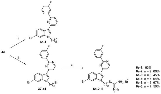 Synthesis of the final target compounds 6e-1–6. Reagents and conditions: (i) 1-bromohexane, K2CO3, DMF, 50 °C 12 h; (ii) dibromoalkyl chain, K2CO3, DMF, 50 °C 12 h; (iii) thiourea, isopropanol, 80 °C, 14 h.
