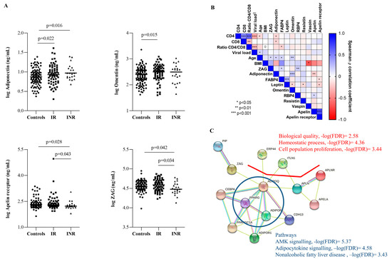 Circulating adipokine concentrations before initiating ART. (A) Baseline concentrations of adiponectin, omentin, APLNR, and ZAG in controls (n = 120), IRs (n = 77), and INRs (n = 22). p-value indicates significant differences among indicated groups by nonparametric Mann–Whitney test. (B) Heatmap showing the correlation analyses between all adipokines evaluated and clinical characteristics at baseline. Correlation matrix is color-coded according to the Spearman (ρ) correlation coefficient (−1:1, red: blue through white), and correlations with statistically significance are indicated. (C) Network interactions generated with the set of the four differentially expressed biomarkers at baseline (adiponectin, apelin receptor, omentin, and ZAG) identified by the STRING database. The STRING database identified different biological processes associated with our network using the false discovery rate (FDR). Adiponectin = ADIPOQ, apelin receptor = APLNR, omentin = ITLN1 and zinc-alpha-2-glycoprotein = ZAG.