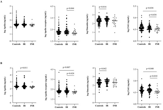Follow-up circulating adipokine concentrations. Circulating apelin, APJ, omentin, and ZAG concentrations at (A) 48 weeks and (B) 144 weeks after ART in cases (IRs (n = 77) and INRs (n = 22)) compared to controls (n = 120). p-value indicates significant differences among groups by nonparametric Mann–Whitney test.