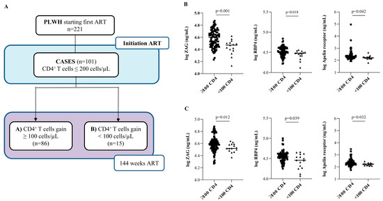 Validation cohort using CD4+ T-cell count gain as a marker of immune recovery. (A) Flow chart illustrating cases (n = 101) categorized according to CD4+ T-cell count gain after 144 weeks of ART initiation instead of 250 cell/µL CD4+ T-cell count cut-off: A group for those who gained ≥ 100 cells/µL, and B group for those who gained < 100 cells/µL. (B) Circulating ZAG, RBP4, and APLNR concentrations at baseline (B,C) at 144 weeks of ART. p-value indicates significant differences among indicated groups by nonparametric Mann–Whitney test.