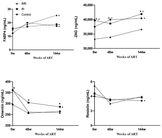 ART effect on circulating adipokine concentrations. Longitudinal study of circulating FABP4, ZAG, omentin, and resistin concentrations during ART follow-up. * indicates significant differences at 144 w compared to baseline values using the Wilcoxon test. ● indicates significant differences compared to controls (n = 120), ▲ indicates significant differences between controls and IR, and Ø indicates significant differences between INRs (n = 22) and IRs (n = 77) at each point of time, by nonparametric Mann–Whitney test.