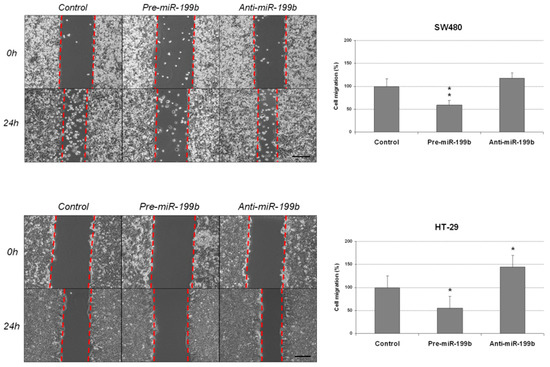 MiR-199b modulates cell migration in CRC cells. Wound-healing assay showing migration of SW480 and HT-29 cell lines after transfection with pre-miR-199b and anti-miR-199b. Dashed lines represent the migration border; * p < 0.05; ** p < 0.01. Scale bar: 200 µm.
