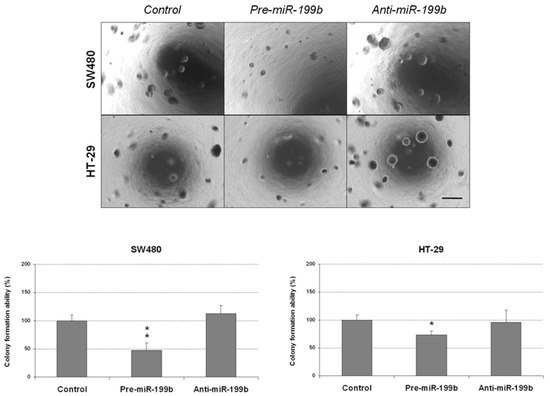 MiR-199b deregulation affects the colony-forming ability of CRC cells. Colony-forming assays showing the effect on the anchorage-independent cell growth of SW480 and HT-29 cell lines after ectopic miR-199b silencing or overexpression; * p < 0.05; ** p < 0.01. Scale bar: 200 µm.