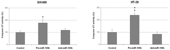 MiR-199b induces apoptosis in CRC cells. Caspase-3/7 activity assay showing levels of apoptotic SW480 and HT-29 cells after transfection with pre-miR-199b and anti-miR-199b; * p < 0.05; ** p < 0.01.