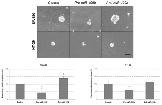 We further explored the biologic effects of miR-199b deregulation in CRC by analyzing the colonosphere formation ability of SW480 and HT-29 cells. Notably, miR-199b overexpression led to significant decreased colonosphere formation ability in both number of colonospheres formed (Figure 4) and cells per colonosphere (Figure S5), suggesting that miR-199b would be playing an important role in colonosphere formation and self-renewal of CRC cells. Conversely, colonosphere formation was enhanced by the transfection with anti-miR-199b in both cell lines, but significance was only achieved in SW480 cells.