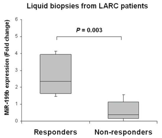 We next evaluated the clinical impact of miR-199b as a predictor of response to preoperative CRT in LARC. Our patient cohort was stratified into responders and non-responders to neoadjuvant therapy. As a preliminary analysis we compared global miR-199b expression between both subgroups, observing that the subgroup of non-responders had substantially lower miR-199b levels than responder patients (p = 0.003) (Figure 5).