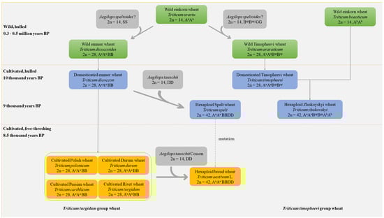 The domestication of wild emmer wheat started about 10 thousand years BP (Figure 1), which symbolized the first and significant evolution intervention by humans and raised the Neolithic revolution [,]. Consequently, two cultivated tetraploid wheat, T. turgidum concv. dicoccon (2n = 4x = 28, AuAuBB) and T. timopheevi concv. timopheevi (2n = 4x = 28, AuAuBspBsp), were domesticated from T. dicoccoides and T. araraticum, respectively [,,,,,,]. Since the birth of domesticated emmer wheat in the Fertile Crescent, T. dicoccon has been widely spread from farming villages in Pre-Pottery Neolithic B (PPNB) to the Mediterranean region and has become one of the most prominent crops for almost 6 thousand years [,]. Around 9 thousand years BP, allohexaploid Spelt wheat (Triticum spelt, 2n = 6x = 42, AuAuBBDD) was produced through the natural hybridization between T. dicoccon and Ae. tauschii [,,]. In addition, the domesticated T. timopheevii naturally hybridized with T. boeoticum gave rise to the hexaploid Zhukoyskyi wheat (Triticum zhukovskyi, 2n = 6x = 42, AuAuBspBspAbAb) in Transcaucasia [,]. About 8.5 thousand years BP, the currently most cultivated durum wheat (T. turgidum concv. durum) with a tough rachis and free-threshing seeds was produced from natural mutation of T. dicoccon in the Eastern Mediterranean region (Figure 1) [,]. The subsequential polyploidization between domesticated emmer T. dicoccon (or cultivated T. durum) and Ae. tauschii Coss. gave rise to bread wheat [,]. Additionally, some research indicated that bread wheat was produced by the mutation of Triticum spelt [,].