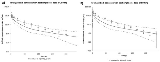 Verification of the gefitinib human PBPK model: predicted geometric mean (solid black line) and observed geometric mean (data points) ± standard deviation (error bars) of total gefitinib concentration post single oral dose of (A) 250 mg and (B) 500 mg [27]. The dashed lines refer to the predicted 95th percentile range. Virtual population demographic was simulated to be equivalent to the reported study (healthy volunteers, aged 21–57 years old, 0% female, n = 100).
