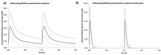 Predicted mean (solid black line) of unbound gefitinib concentration in (A) plasma and (B) jejunum enterocyte for the last two doses during once daily 250 mg oral dose in human over 14 days. The dashed lines refer to the 95th percentile range of the simulated virtual population (healthy volunteers, aged 20–50 years old, 50% female, n = 100).