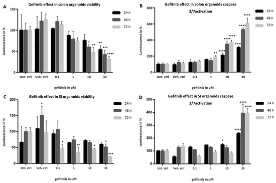 (A–D): Evaluation of viability determined by ATP levels and caspase 3/7 activation of healthy colon (A,B, respectively) and SI (C,D, respectively) organoids when exposed to 0.1, 1, 10, and 30 µM gefitinib for 24 h in black, 48 h in dark grey and 72 h in light grey, compared with Untreated controls. Values are in % of luminescence. For each time point the average of Unt. Ctrl was set to 100%. SD was calculated for each condition. Legend: Ctrl, control; SD, standard deviation; SI, small intestine; Unt, untreated; Veh, vehicle (with 0.1% DMSO). * p-value = 0.01; ** p-value = 0.003; *** p-value = 0.0004; **** p-value = 0.0001.