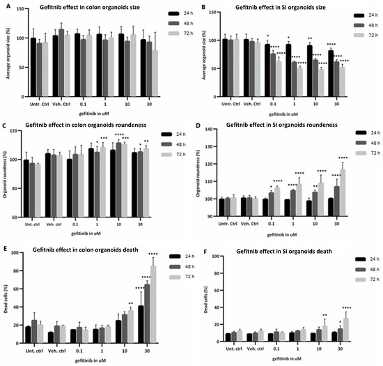 In addition, exposure of colon organoids to gefitinib induced a modest time and concentration-dependent decrease of the nucleus size, with significant decreases in the number of nuclei per organoid at 48 h and 72 h (Figure S1A,C), which corresponds to an increase in cell death. In SI organoids, exposure to gefitinib led to a modest reduction of both nucleus size and number per organoid, being more significantly decreased at 30 µM and 72 h (Figure S1B,D), indicating an induction of cell death at later time points. Furthermore, Figure S1E,F show microscope images of colon and SI organoids, comparing the morphological changes between the controls and gefitinib treatments.