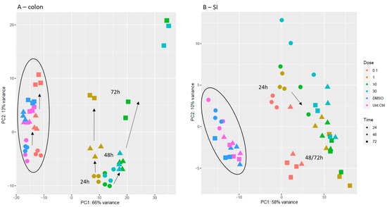 PCA score scatter plot obtained for the mRNA transcriptomic analysis of samples collected from colon organoids (A) and SI organoids (B). Direction of the arrows indicates the evolution in time of the samples (24 h → 48 h → 72 h). In colon plot, cluster on the left comprises non-treated samples (untreated and vehicle controls); in SI plot, cluster on the left comprises non-treated samples and treated samples with 0.1 µM gefitinib. Legend: untreated controls are in pink; vehicle controls (DMSO) are in dark blue; 0.1 µM gefitinib in red; 1 µM gefitinib in dark yellow; 10 µM gefitinib in green; and 30 µM gefitinib in light blue. Circles represent 24 h; triangles, 48 h; squares, 72 h.